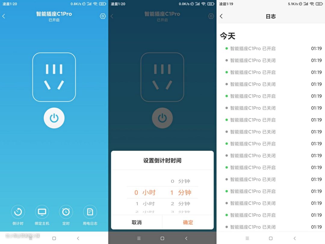 在主界面下方则是几种基本功能设置,其中倒计时功能可以实现定时关闭电源的功能。而倒计时功能则是近似于shutdown命令的自定义关机倒计时。而日志功能,这款C1Pro则没有功率监测和统计功能,只能记录插座开启和关闭的时间。
