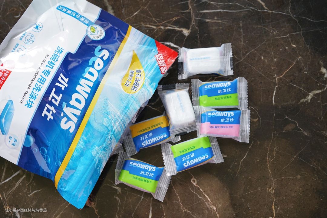 不过目前市面上的洗碗块基本都是多效合一的,既有洗涤成分,还有软水成分,又能防止水渍残留,使用起来就更方便了。