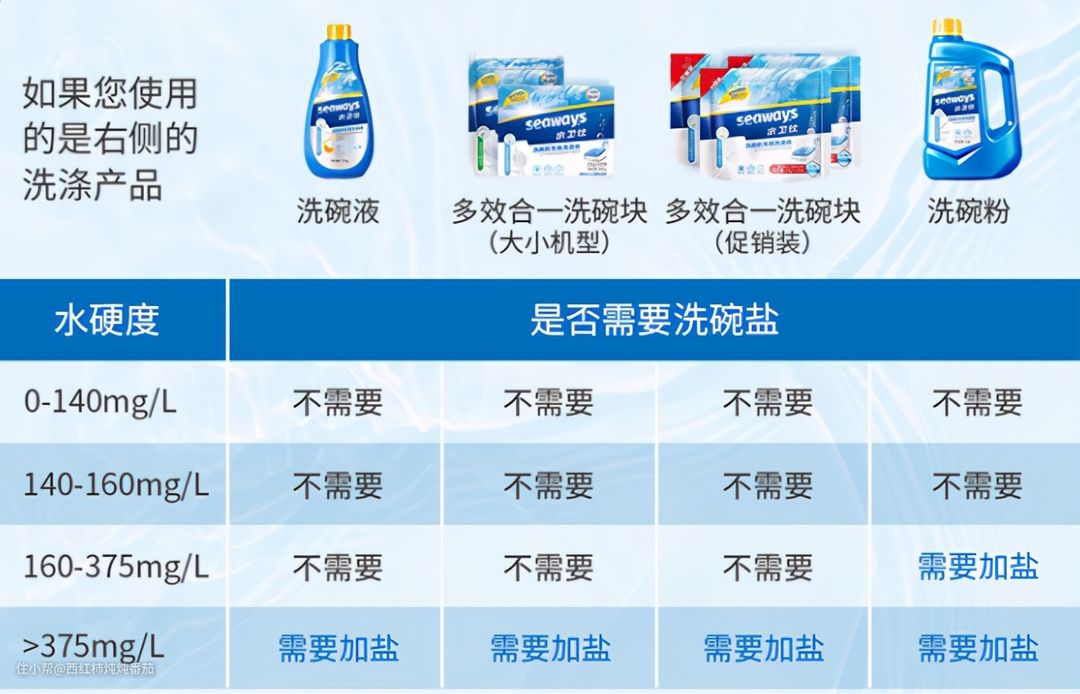 仔细观察上面这份对照表,我们不难发现,目前很多多效合一洗碗块其实本身就包含了软水成分,只要不是水质硬度特别高的地区,甚至可以直接省掉定期添加软水盐这步操作!这对于像水槽洗碗机、台上小型洗碗机这类设备来说无疑是个福音。具体我们下文再表。