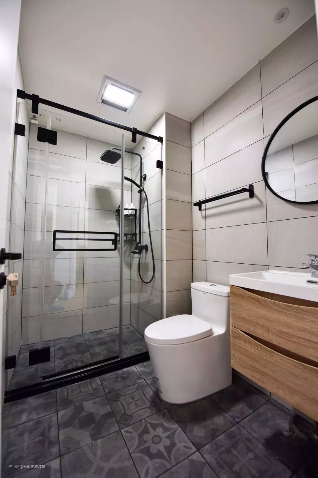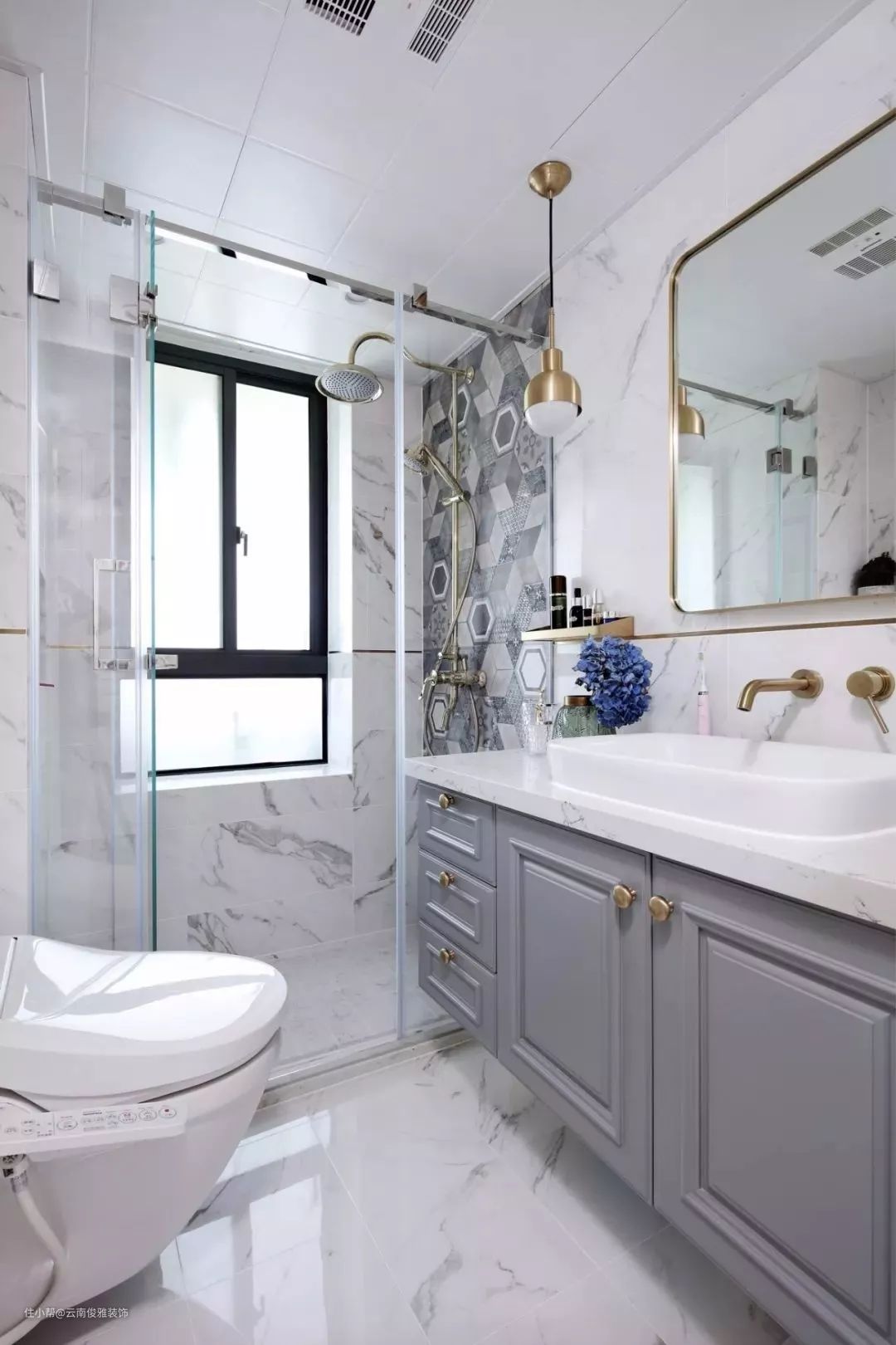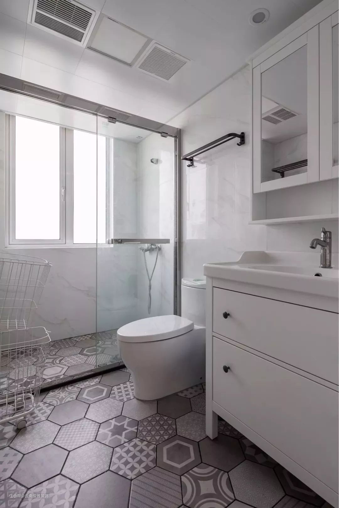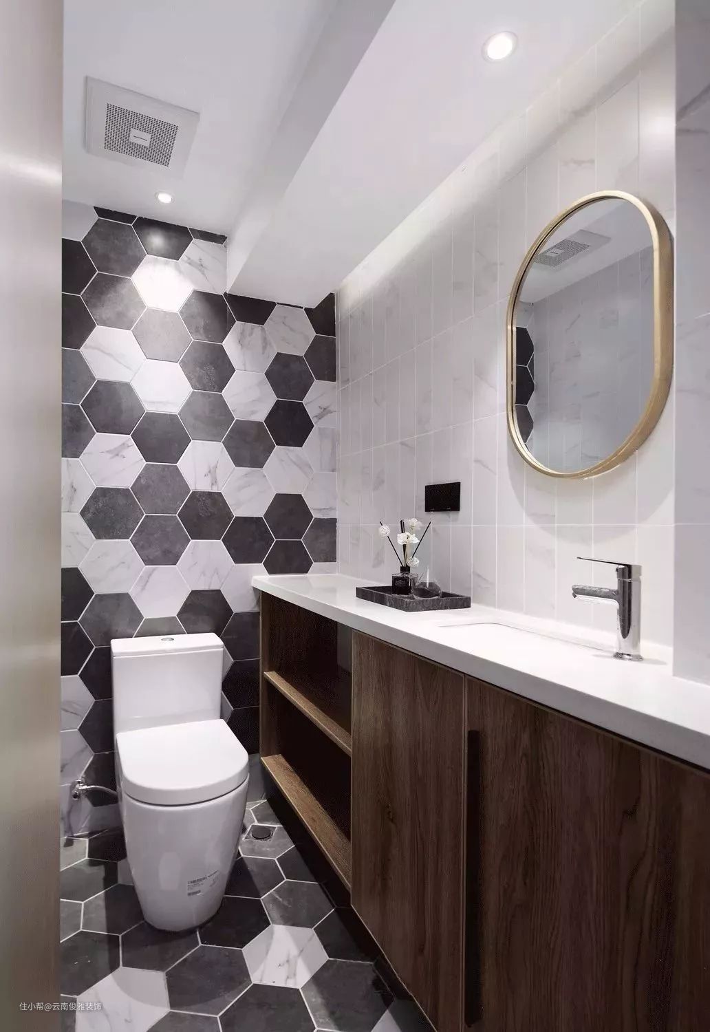 六角砖对于卫生间、厨房或者玄关来说都是常见的选择,非常有文艺复古气质,不过考虑到施工难度,一般来说更适合精巧的小户型卫生间。