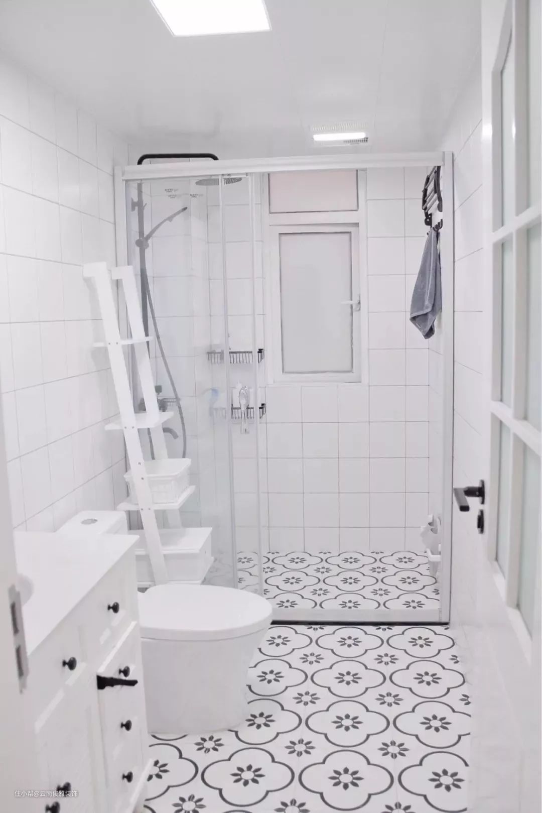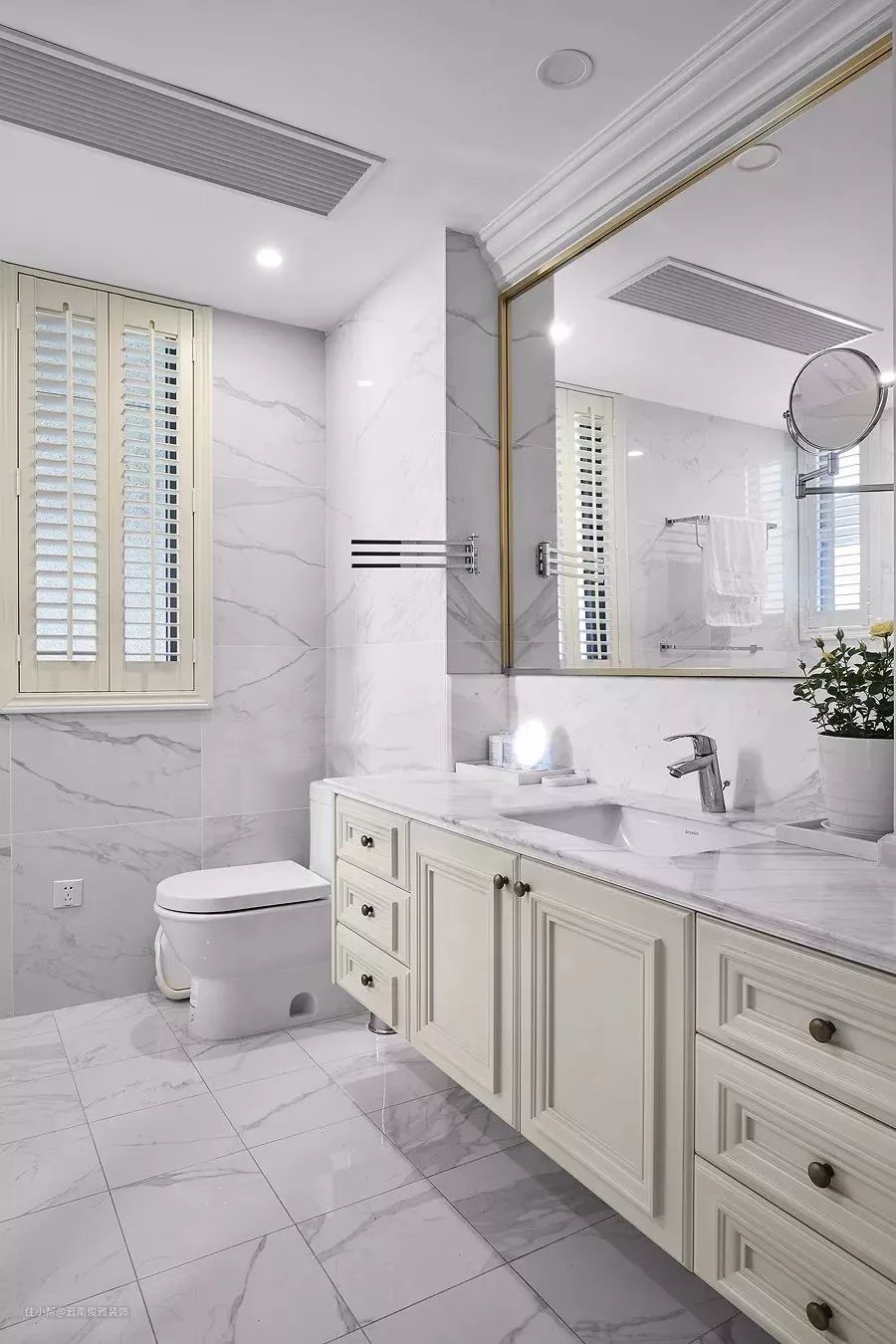 白色系地砖,通常对于喜欢卫生间保持明亮洁净的朋友们来说,白色系墙地砖最合适。除了纯白,现在很流行的ins大理石纹和小方砖都很适合做卫生间地砖。