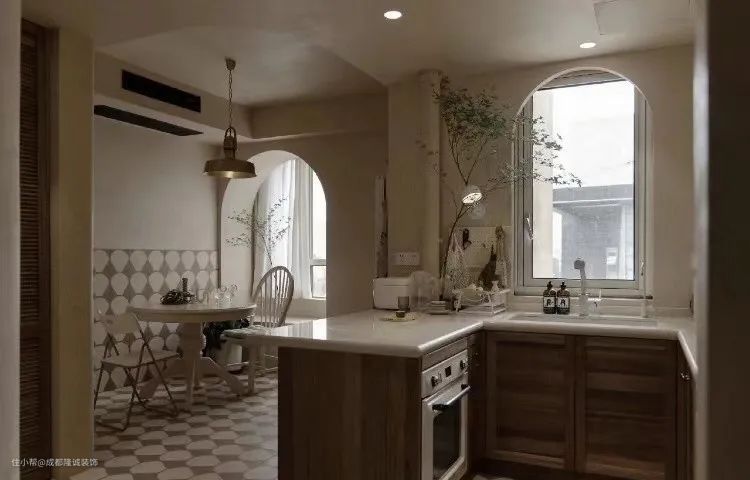 拱形门用于厨房,带有弧度的门洞不显得单调,开放式厨房用起来尤为“美貌”,无需装门,让每一次下厨都更有仪式感