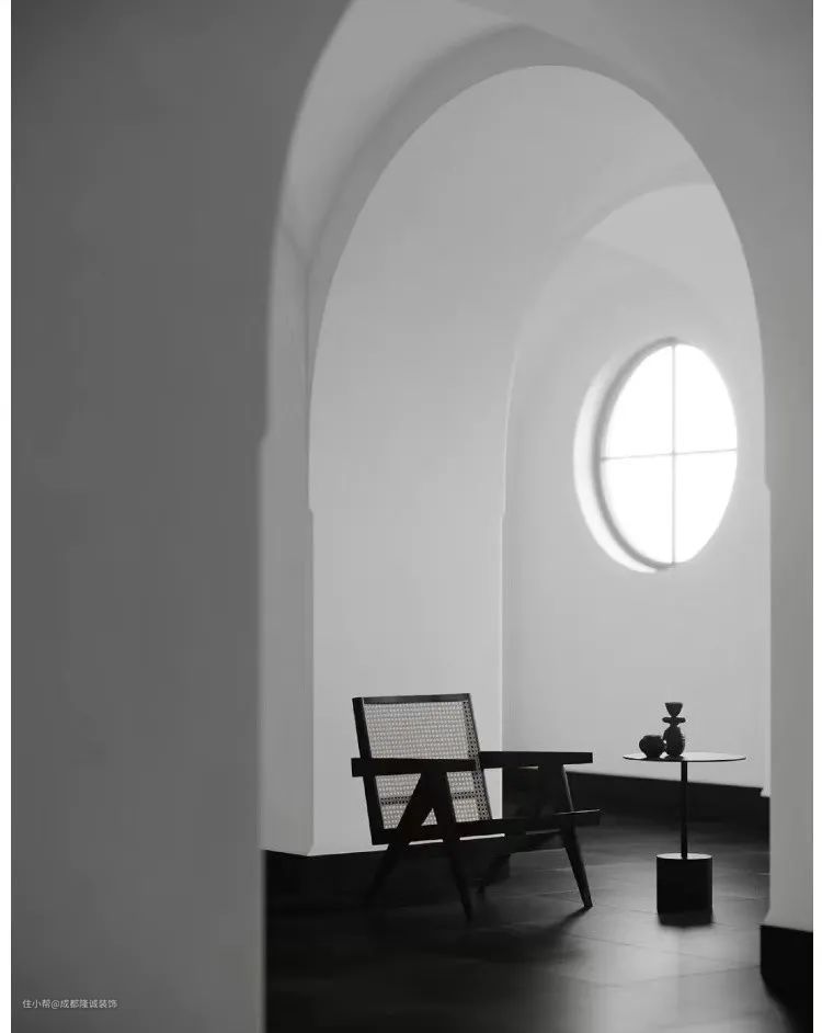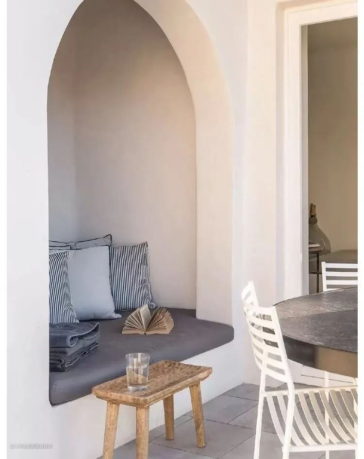 ↑干净白色的护墙立面、优雅的拱形门、简洁的定制陈设,无声的诉说着浪漫的生活情调