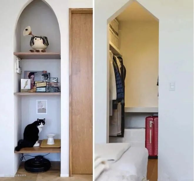 ↑复古又温柔的木色调门套拱门搭配整个素雅的空间,散发温暖和温馨的气息