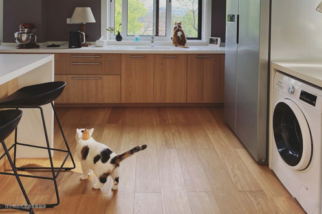 很多人可能担心是开放式厨房,被油烟污染,但其实只要是可靠的油烟机,都不会有问题。当然,旧厨房要尽量打扫干净。家里的猫好可爱。