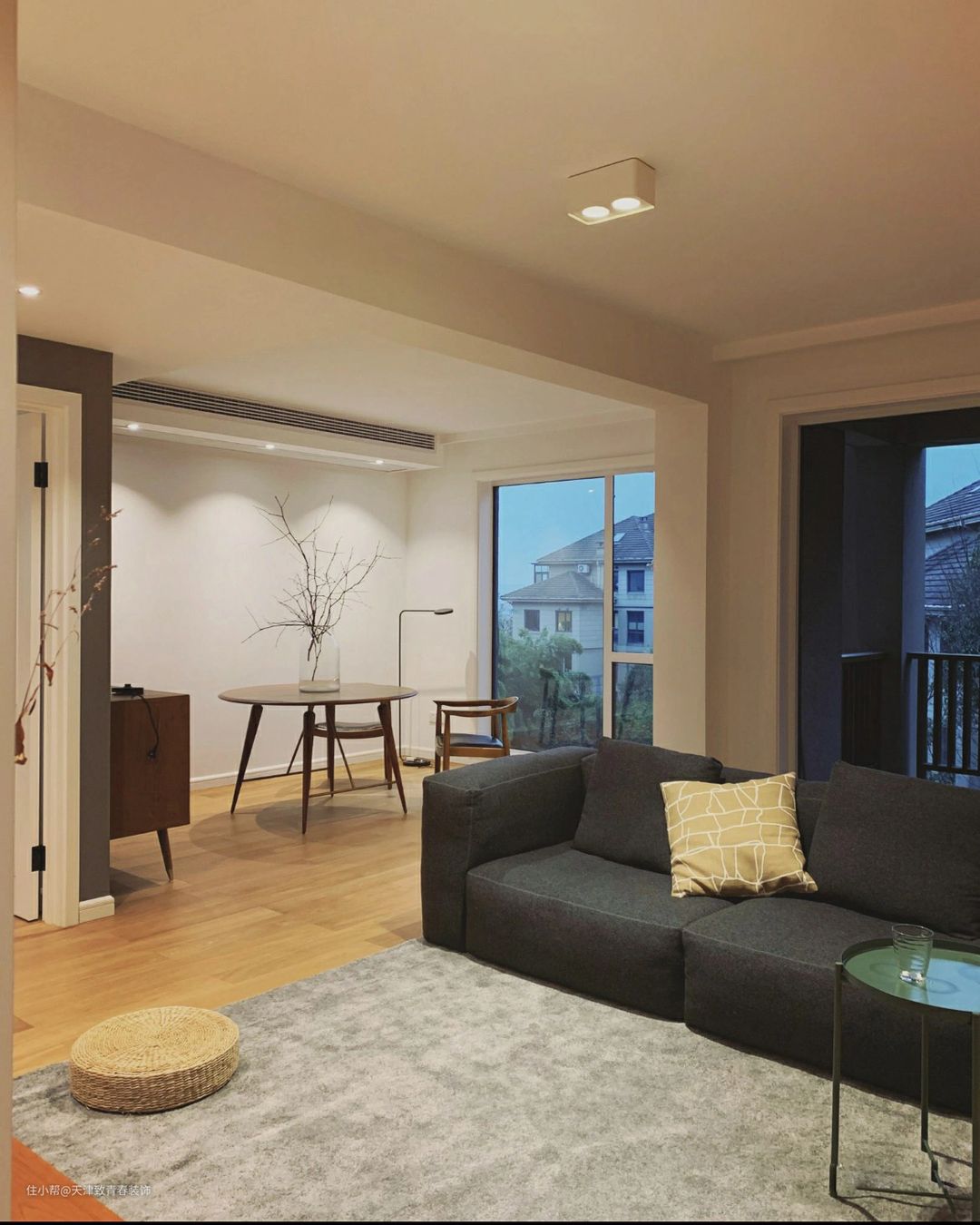 餐厅的沙发上放着茶几,上面铺着灰色地毯,很有层次感。电视背景墙完全不塑形,搭配的沙发坐起来很舒服,与整个空间的原木色完美搭配,非常和谐。家里养猫没关系。沙发后面有个阳台。其实主人的房子楼层不高,外面可以直接看到绿树,相当于一幅画的感觉,很舒服。这就是自然的感觉。客厅阳台没得选开,不影响。
