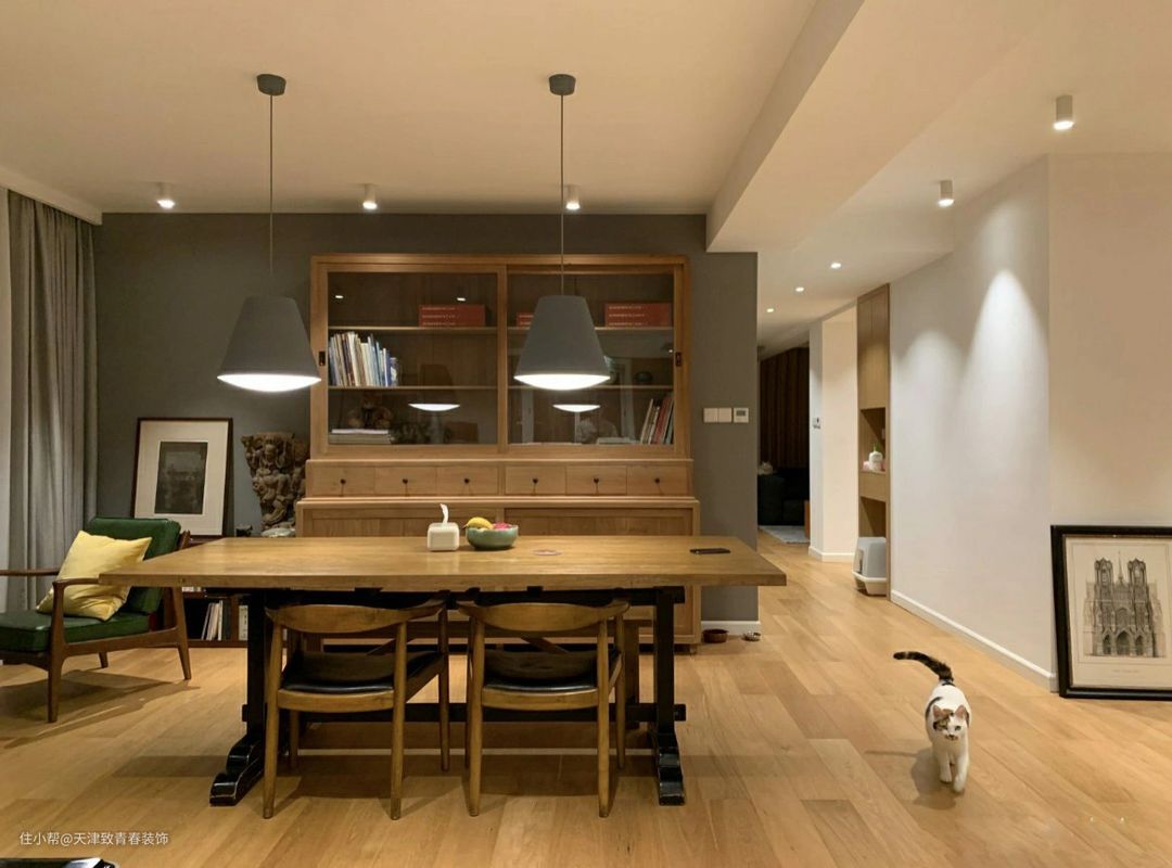 方形餐桌长度其实还是足够的,并且非常有质感,即使没有隔热层和餐桌布,也不影响。屋主他们夫妻俩在餐厅用餐,都是一种享受,太幸福了。顶面安装了比较大尺寸的吊灯,加上一些局部的射灯,足够照明亮度。