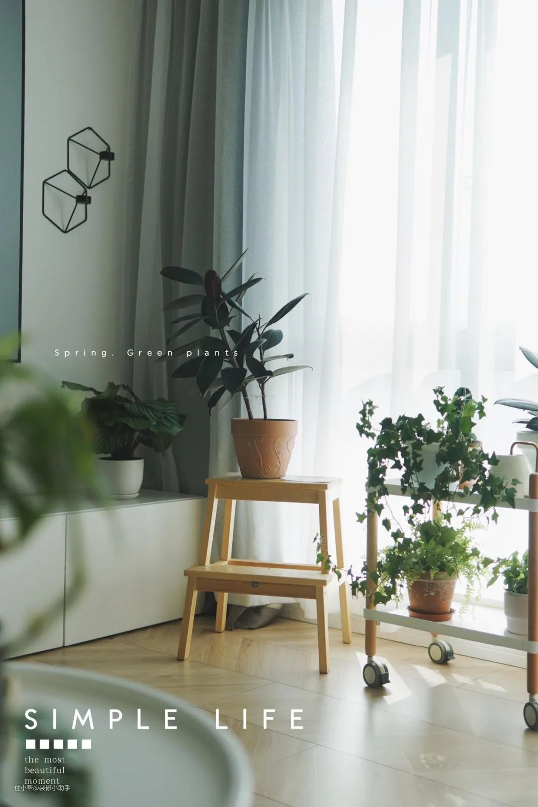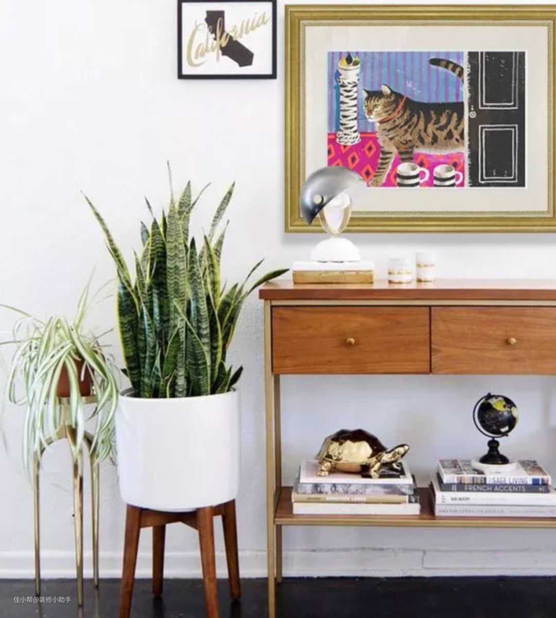借助圆凳、板凳、水桶或木箱来摆放。不仅给植物更加协调的高度,拉开层次,同时,和绿植本身搭配也更显别致,绿植也可以更融入家居环境