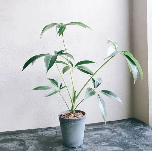 这种植物茎杆直立,枝干光滑少分枝,叶子是掌状复叶,有的三五片撑开来,大一些的植株上一枝有10片左右叶子舒展开来,叶片狭长,叶尖微微下垂,正好组成一把伞的形状,放在客厅最合适不过了。
