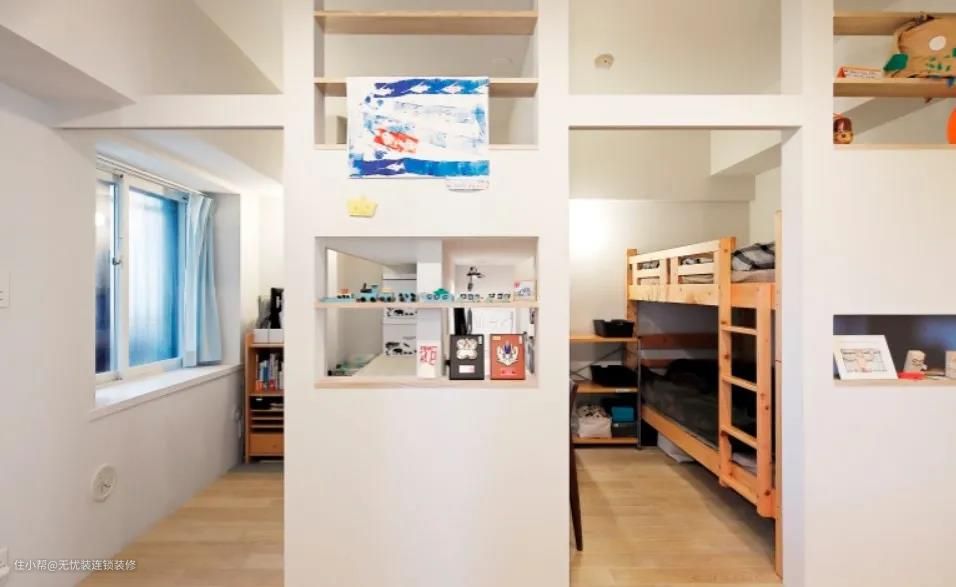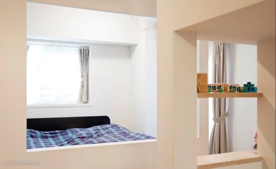 卧室都没有门,用卷帘窗帘装修背景墙,不占据室内空间设计,白天把卷帘窗帘拉起来,小朋友在屋子里可以 随便地活动,晚上把卷帘窗帘放出来,就变成一个私密的室内空间设计。