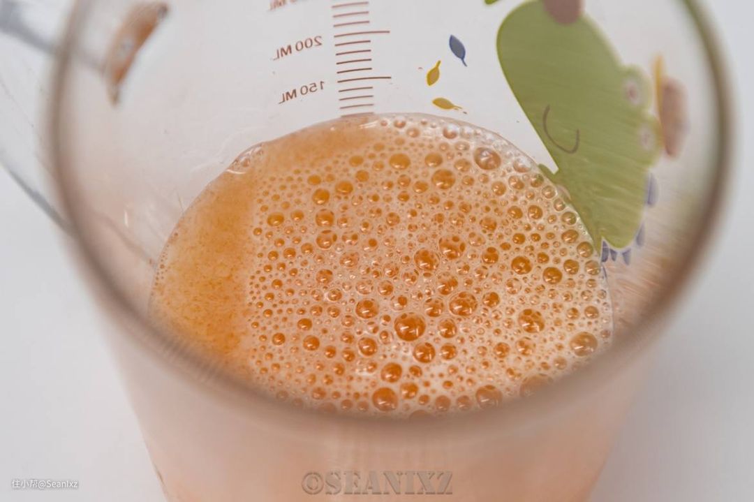 这里用血橙榨汁测试了一下,橙子这类软质果肉出汁率会稍低一点,不过有个优势是不会把籽打碎,橙子籽味道太苦,曾尝试过用破壁机打碎再过滤做橙汁,味道确实会受到籽的影响,会有些发苦。