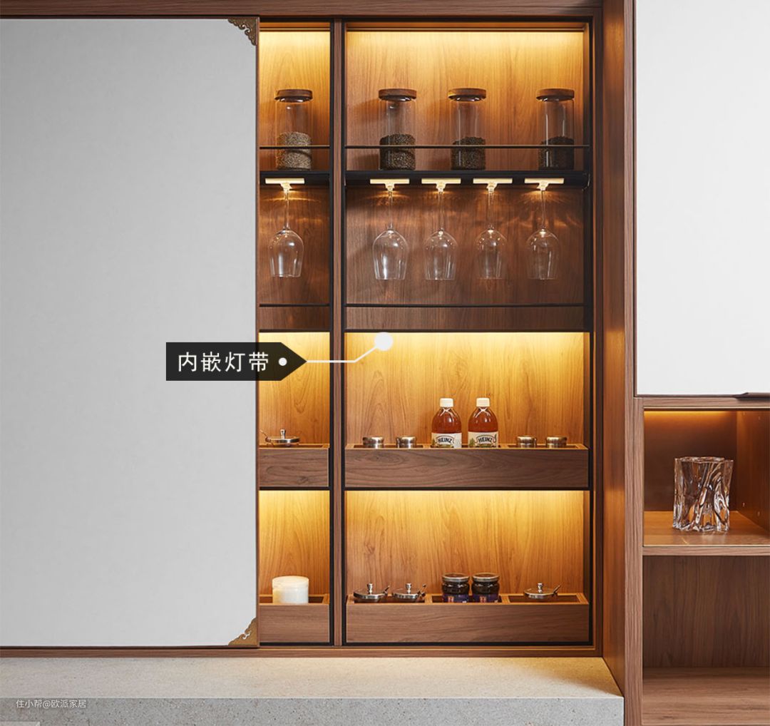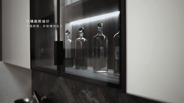 ▲玻璃柜可用于存放红酒及玻璃器皿,在灯光加持下,彰显精致优雅生活。