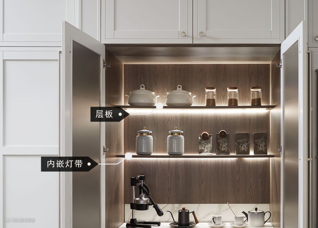 ▲玻璃掩门造型,既保证了颜面,又起到了防尘防潮的作用。柜内顶部为多层层板,可以放置茶叶、杯碟等小物品,在灯带的点缀下,形成了独一无二的风景线。