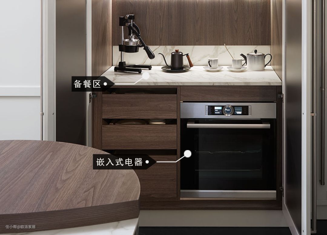 ▲中间台面用于简单早点的备餐之地,底部则设计了嵌入式电器,空间利用率高,美观性和整体性也都增强了。
