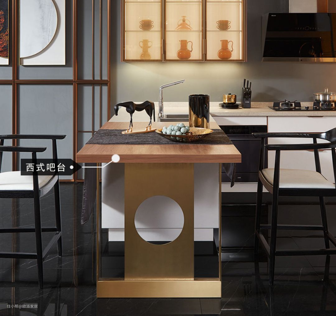 ▲实木弧形椅与吧台合二为一,大大节省厨房空间,带来了不一样的用餐体验,平时还可作为办公、娱乐、憩息的好场所,满足各种生活需求。