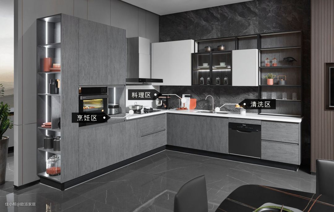 ▲本案例根据户型设计,为以墙角为原点,向两侧墙壁延伸的L型布局。橱柜的左侧为烹饪区,右侧为洗涤区和料理区,洗、切、煮动线流畅,让下厨过程更轻松高效,不管是大户型厨房还是小户型厨房都能适用。