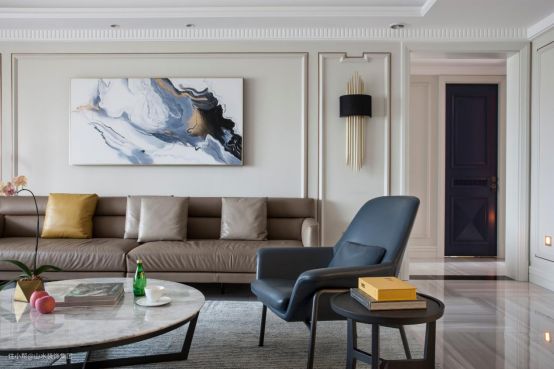 美式风格的客厅在简约中透着优雅范儿,墙面多以线条进行修饰,石膏线搭配着金属线条,别致的壁灯与装饰画点缀,再加上皮质家具,贵族之气便有了。电视背景墙的部分则选择大理石做造型设计,丰富的层次与直线条,赋予空间优雅格调与流动感。