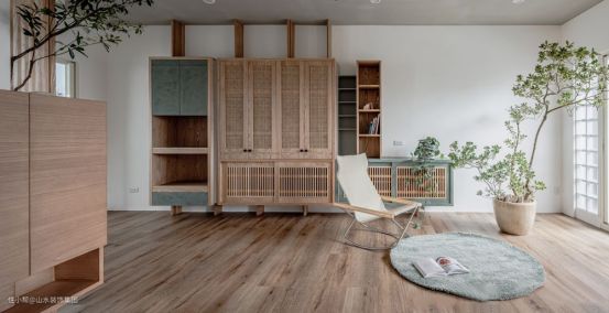 这款日式风格的客厅打破了传统,没有沙发、茶几、电视三大件,而是简单陈设了单椅、地毯以及收纳柜,以休闲为主。保留了大白墙的设计,日式的格栅柜体靠墙而设,柜面增加了烟灰绿进行局部装饰,与木色和谐搭配。绿植位于角落处点缀,清新自然。