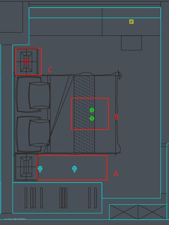 根据卧室功能分区的不同,从平面上去考虑各个点位要使用哪些产品: