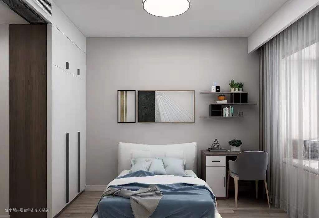 △ 次卧以灰白为主,素雅无比。书桌代替了床头柜,墙面还安装了层板,加之抽象挂画,既不显压迫,也不会让整个空间过于单一。