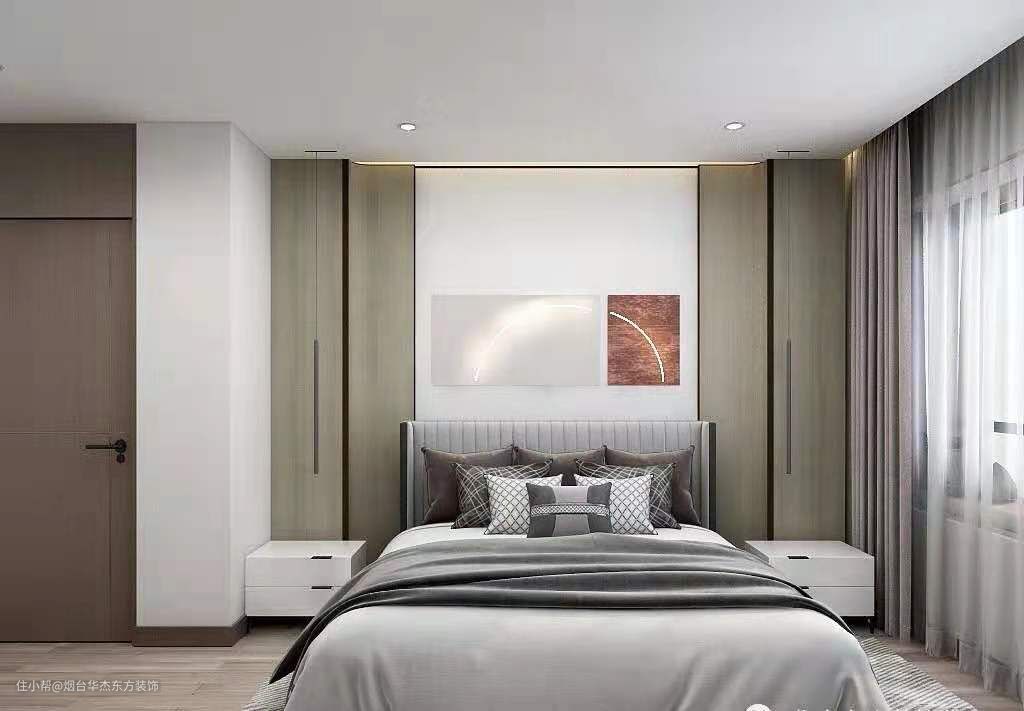 △ 主卧顶面做了平顶,周边暗藏灯带很有空间感。床头背景墙的设计亦有个性,两种板材采用对称手法布局,其中中间木饰面为弧形设计,更为灵动,搭配上挂画、柔软靠背,舒适简洁且美感十足。