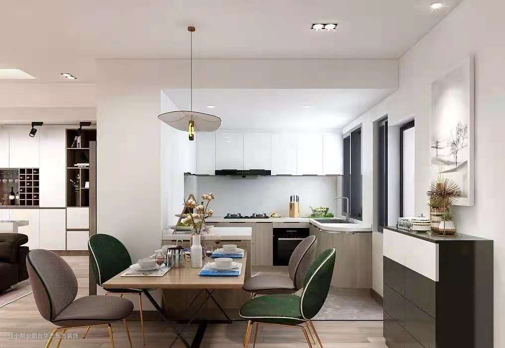 △ 厨房定制了“U”字型的橱柜,将厨房完全利用起来,半点空间都不舍浪费。吊柜为白色,下层是原木色,搭配中间白色瓷砖,显得清爽、明亮。
