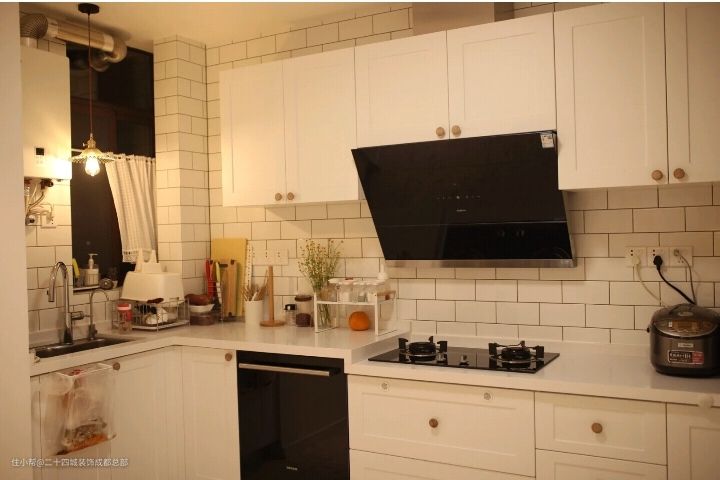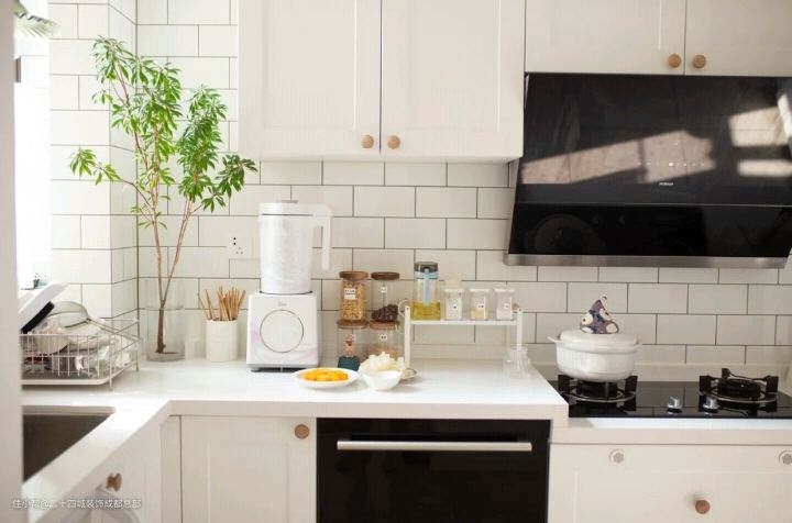 厨房主要以白色为主,白色柜子、白色台面、白色墙砖、白色地砖,大家应该会觉得以白色为主很难打理吧!其实不然,只要你有良好的清洁习惯和勤劳的双手,白色的厨房照样能一直保持干净。