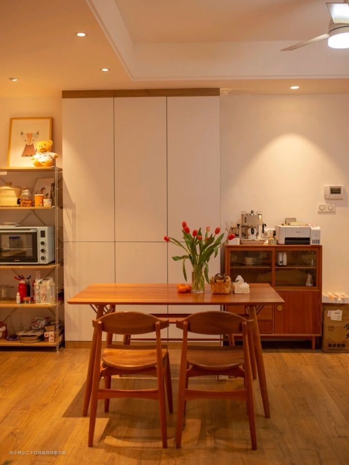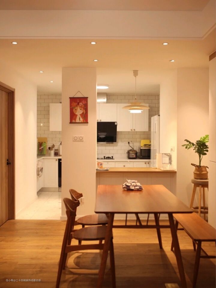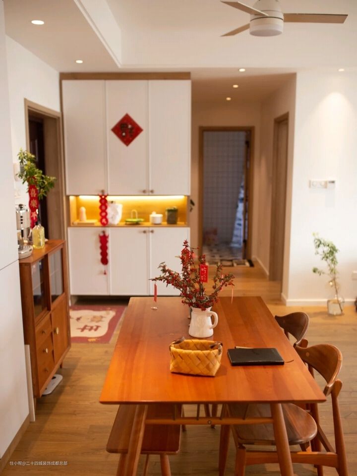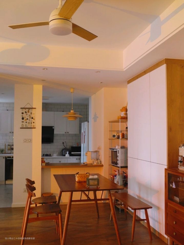 入户的右侧是餐厅,由于是中间户南北不通透的原因,在装修初期屋主就决定在餐厅要用吊扇灯,颜值很高,功能性也不错,一打开,整个空间都流动了起来。