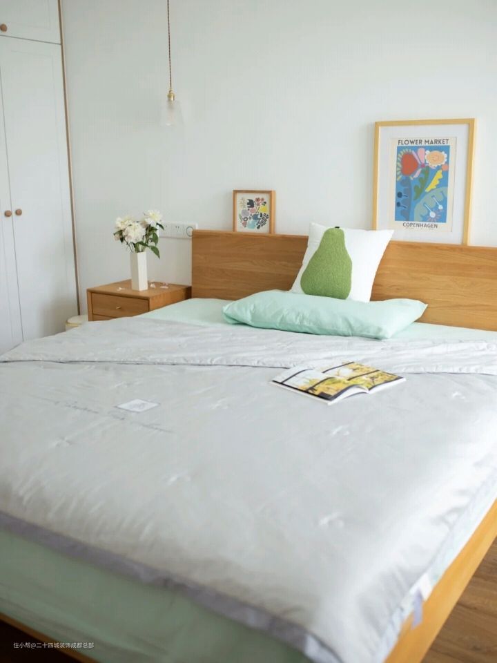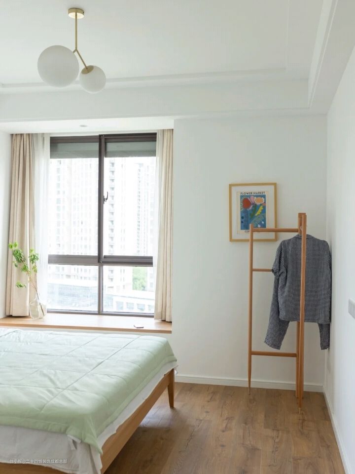 色调简单的大白墙+木质家具和地板,小户型不建议用太多颜色,后期软装上灵活度也更高。