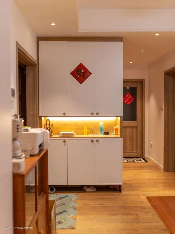 入户的左侧是一个顶天立地式的玄关柜,主要用来收纳家人的鞋子,其次收纳一些日用品;柜体大致分为上中下三个部分,中间是镂空设计,方便平时回家可随手安放包包、钥匙等小件物品。