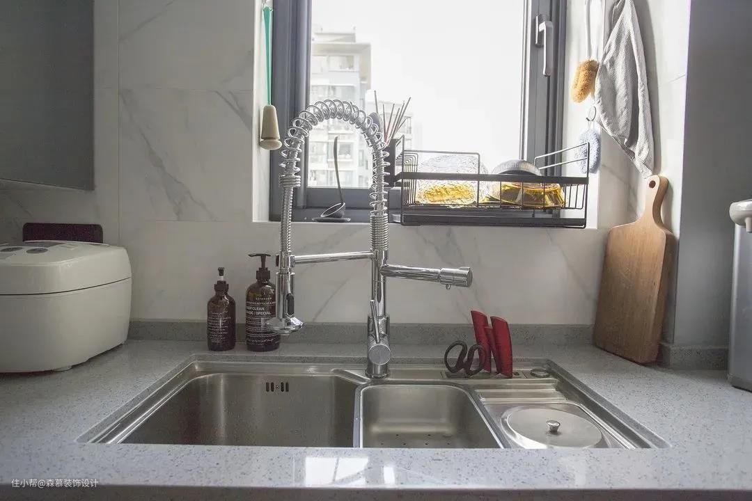 水槽高度在90cm家里的长辈使用的时候不用弯腰,所以在定制橱柜的时候可以和商家沟通清楚,高度差能让厨房操作间变得更舒适:灶台区80cm、水槽区90cm。