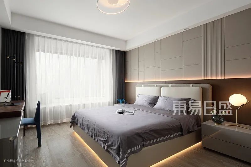 没有繁杂的家具,卧室变得舒畅整洁。突出的线条感尽收眼底,协同柔美的光线调和成温馨的暖色调,窗户尽职地将日出日落、云舒云卷统统捧在你眼前。