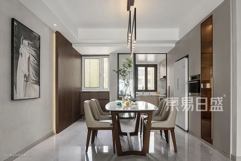 客厅偏向成熟稳重的都市风,而餐厅则更趋近清新自然风,配上餐桌生机勃发的小盆栽,整个餐厅给人一种如春风般和煦的亲和力。