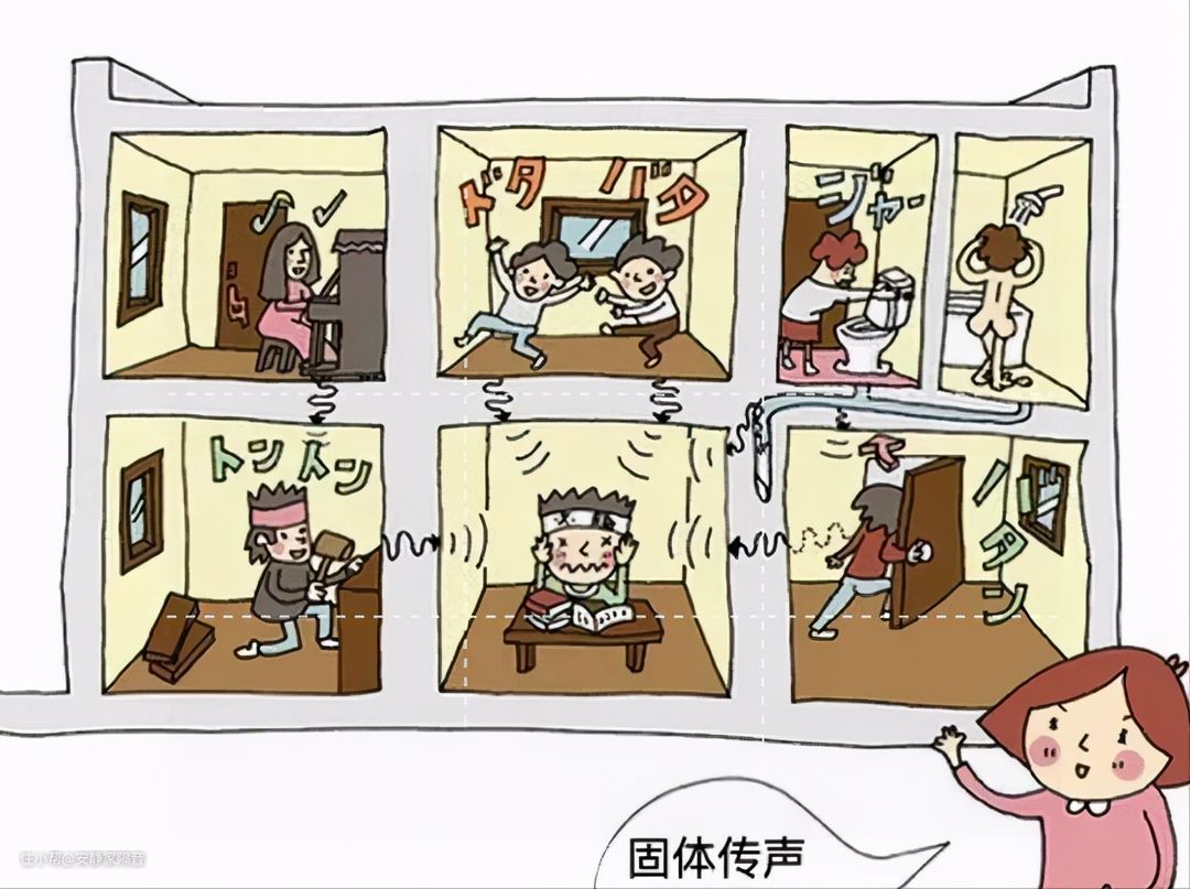 低频噪音也叫“固体传声”,比如:桌椅板凳的摩擦声、脚步声、剁肉馅、摔门声等,会通过墙体和楼板辐射式的传递,有的可以传递好几层。听到噪音是从上方传来,下意识就认为是楼上邻居发出的,事实上,有的建筑结构中,低频噪音会 出现“反向传递”。