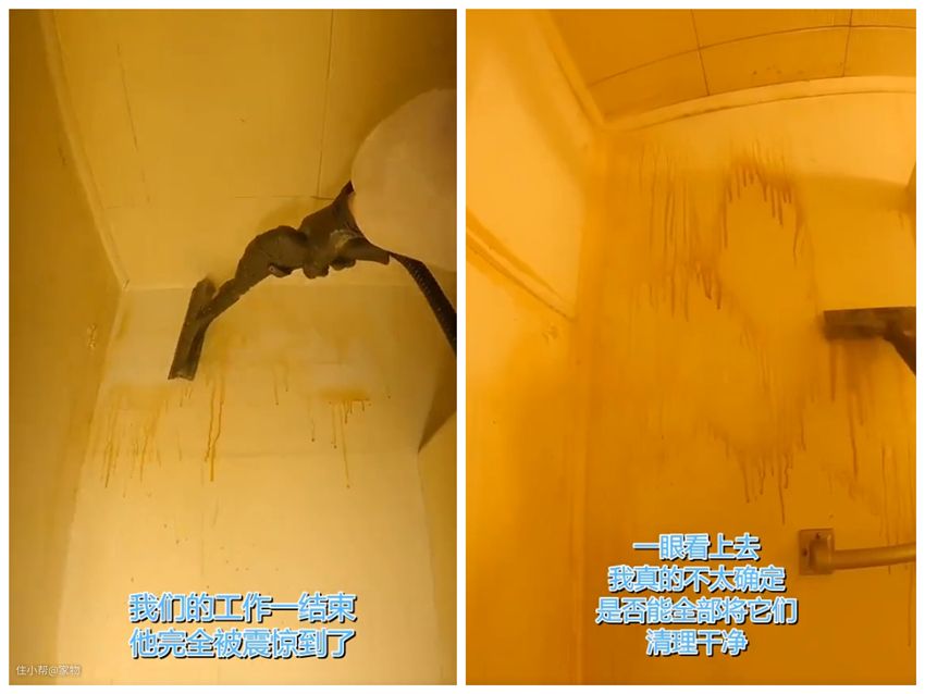而这位清洁师用一台蒸汽清洁机,便开始对墙面的油泥污垢进行清洁,在高温蒸汽的熏蒸下,附着在房间内墙面的油污慢慢“松动”了!