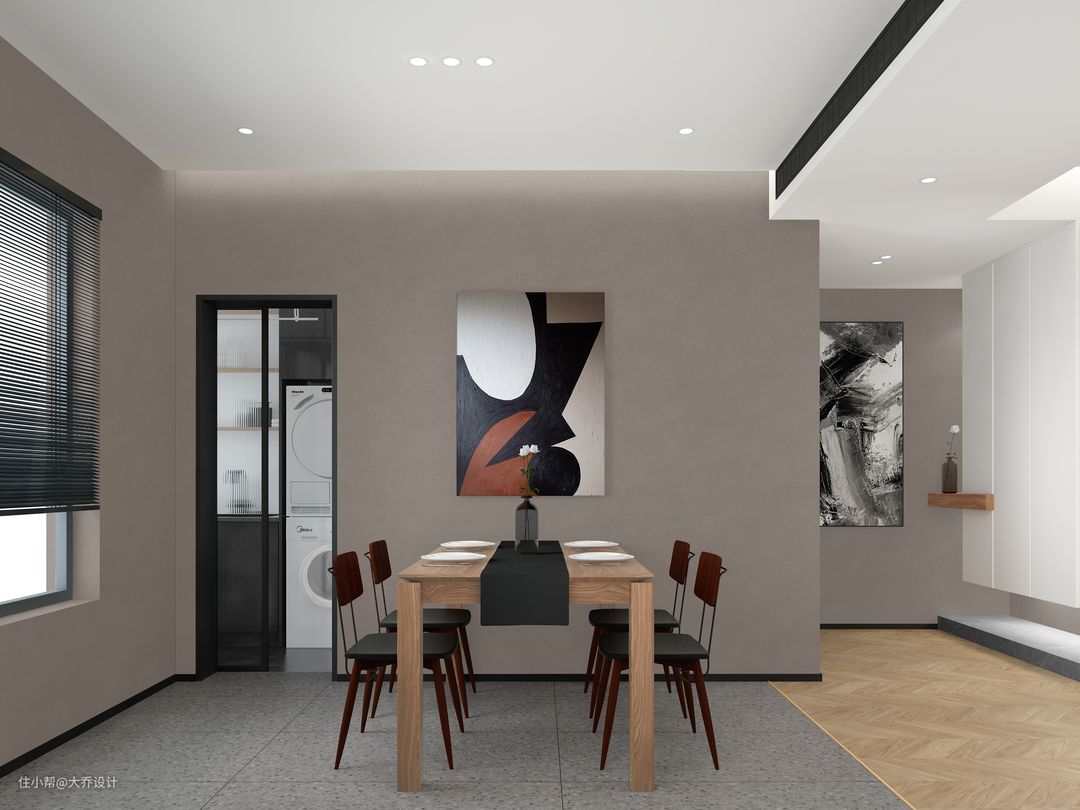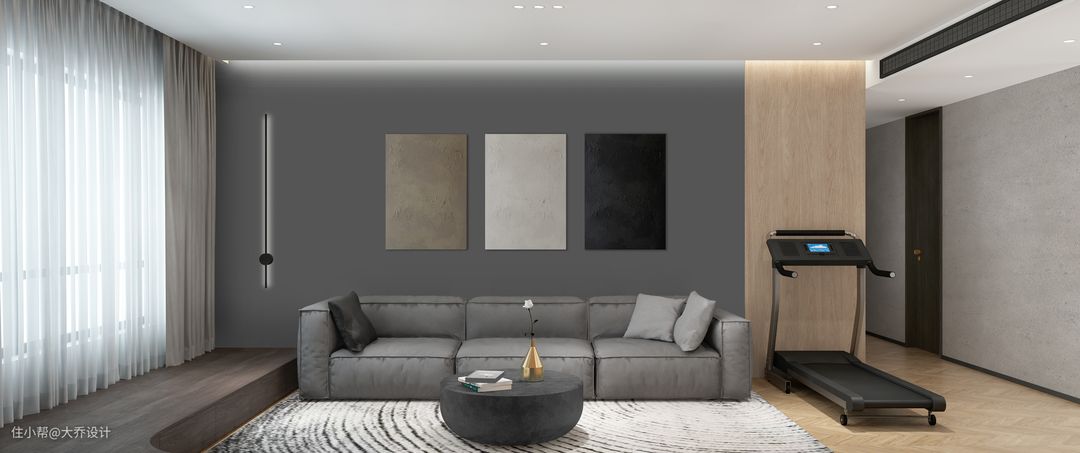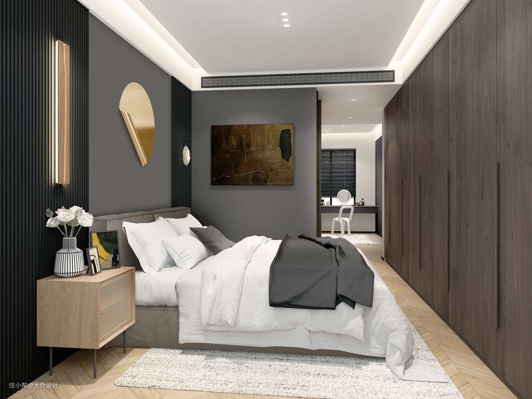 潮妈潮爸的家,喜欢暗黑系又担心过分压抑,采用了高级灰和木色的搭配。室内大面积使用暖灰色的微水泥,卧室使用了深灰色乳胶漆,采用不同的灰阶在空间深浅交替,冷暖穿梭,营造一份更为高级的和谐。