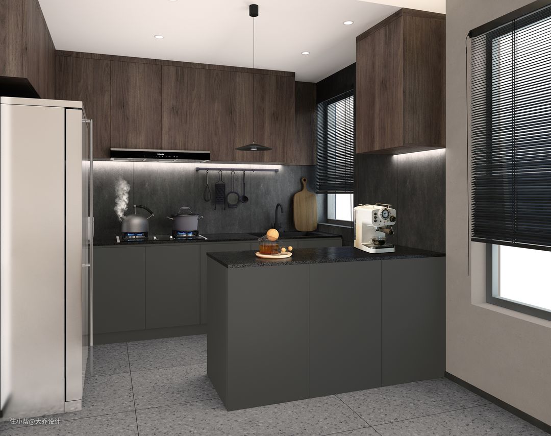 厨房采用开放式设计,岛台的加入增加了操作空间。上下柜不同颜色设计打破了深色系带来的沉闷感。
