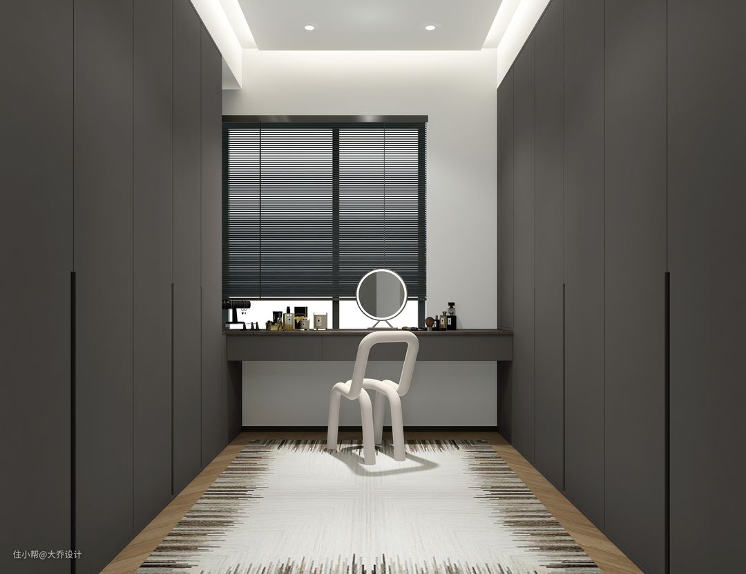 衣帽间深灰色主色调巧妙的设计了化妆区间。