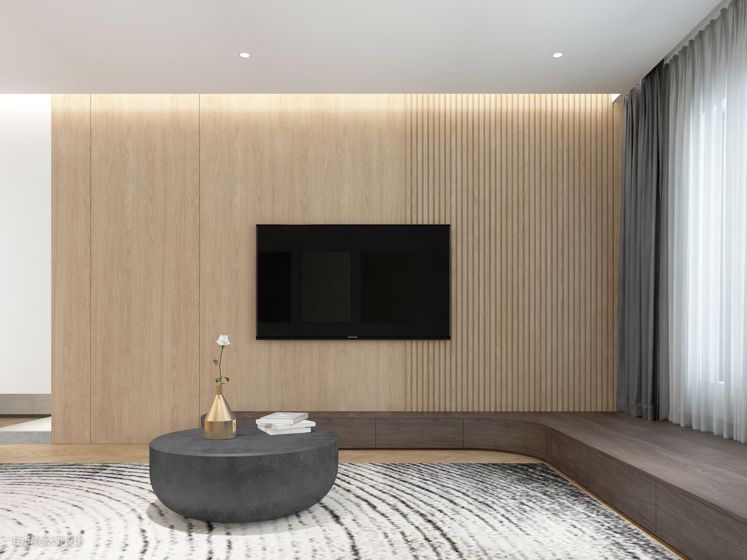 电视背景大面积使用了木色格栅➕隐形门的设计。