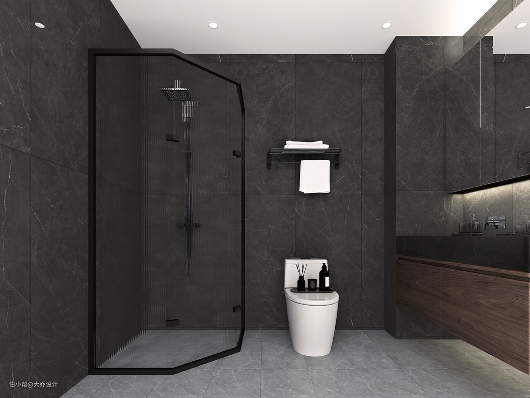主卫同样延续了深灰色主色调,高级极简。淋浴区用了长虹玻璃浴屏,凸显艺术感。