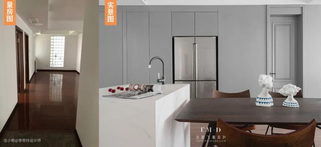 设计亮点:拆除玄关部分非承重墙,将厨房门移位,原始门洞设计嵌入式玄关柜,缓解玄关收纳压力;冰箱移入餐厅,嵌入储藏间的墙体,并在餐厅设计岛台,功能更丰富实用。