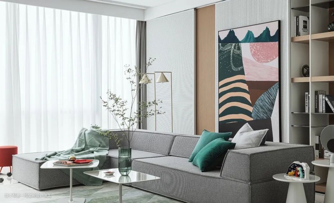 如果胆子大一点,也可以挑战几何色块的的装饰画,不过一定要选择低饱和度的,原因不用多说了吧。
