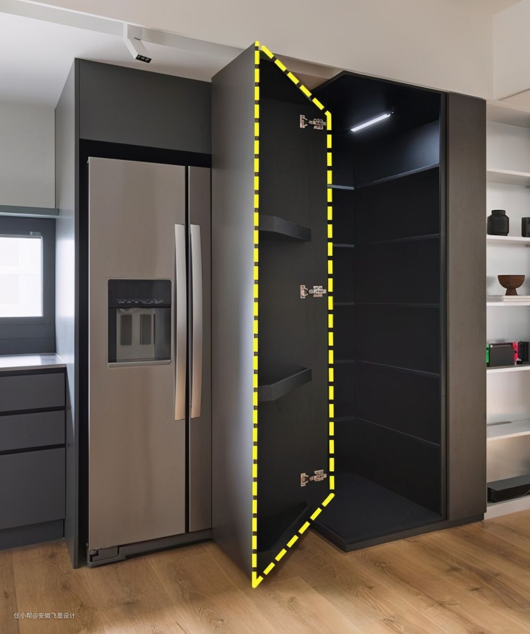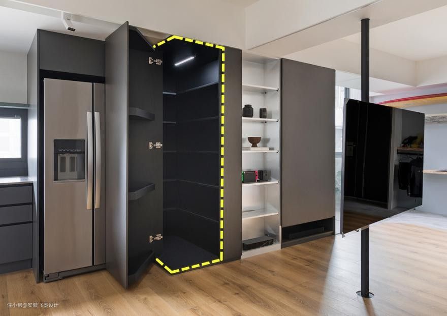 重点藏在这里,冰箱柜旁边的柜子,其实是一个隐藏的储物间!