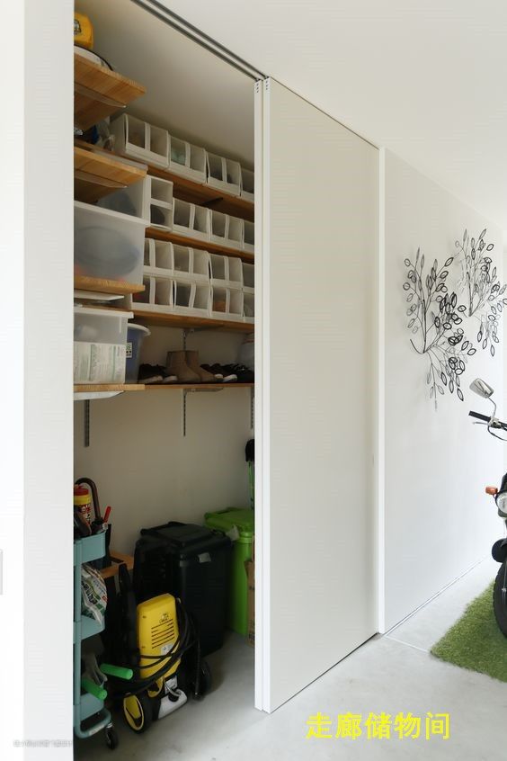 对于日本业主来说,这是一种比较常见的设计,考虑到鞋子的存放以及室内空间的整洁卫生,会把储物间移到这里,内部打上搁板置物架,可以当鞋柜使用也可以存放其他一些杂物。