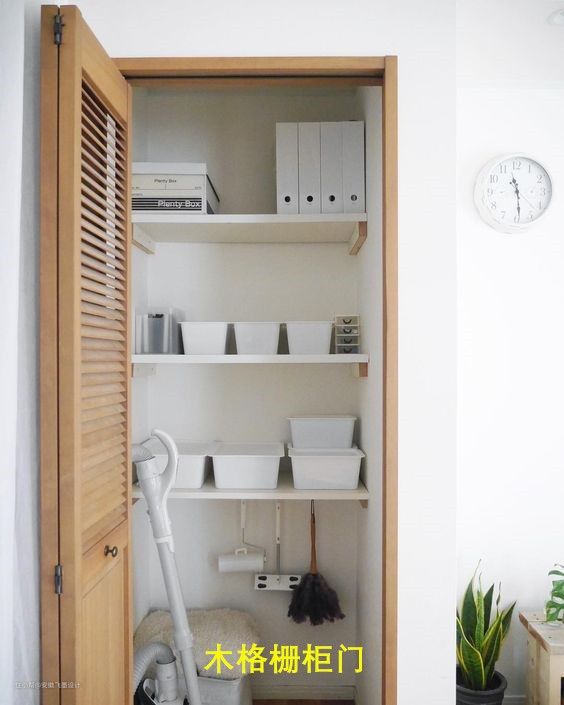 也可以把走道空间利用上,靠墙处打造一个内嵌的步入式衣帽间,常用杂物文件,或是清洁用品,一股脑都放在这里,至于柜门可以选择通风透气的木格栅,防止发霉。