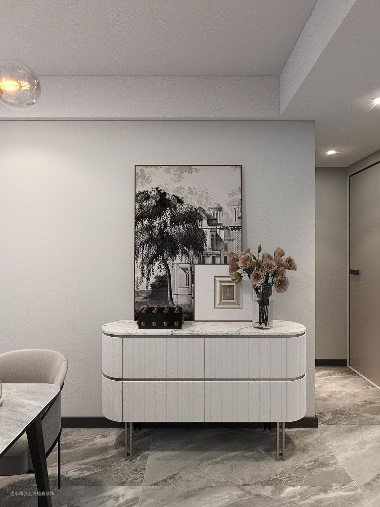 偏法式浪漫风格的白色典雅立柜,再加上一束烟粉玫瑰将整体空间的调性提了上来。