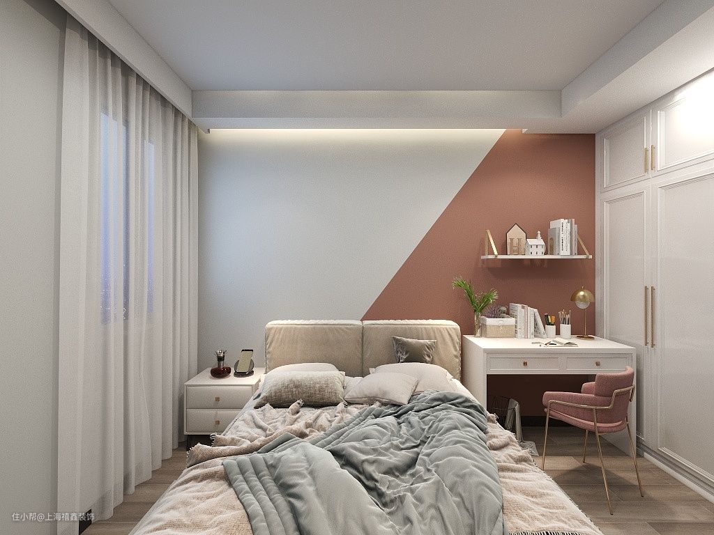 【卧室】烟粉色与白色的斜对角拼接,简洁又柔和。床头配有驼色软包,椅靠更加舒适。写字桌上方挂有一个置物架,装饰收纳两不误。床头配有白色的双层床头柜,与另一边的白色写字桌相呼应。