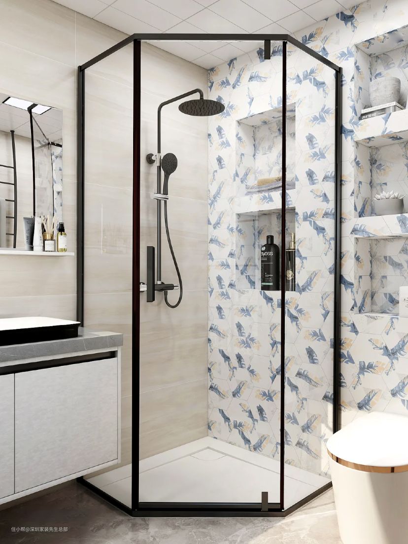 对角选择钻石淋浴房,比一字型和二边型占地面积小,比浴帘更透亮~。