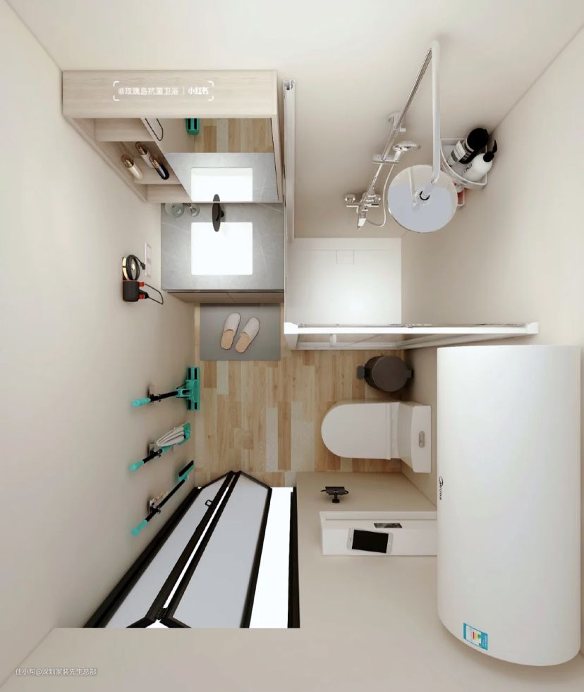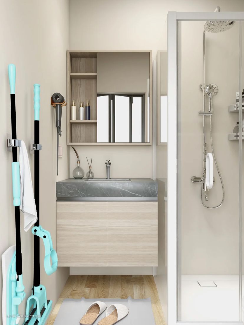 墙边安装地拖收纳器,方便随时清理干燥区域。入口处左侧安装坐厕,切记坐厕两侧与墙/浴室的距离至少30厘米,每天上卫生间才不会感到拥挤。