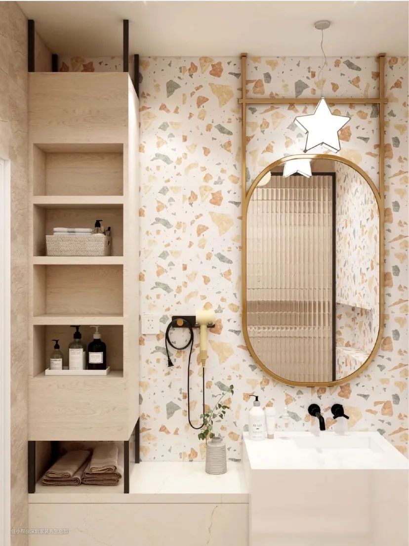 左面做了一个顶天立地的收纳柜,延伸出洗漱区这一块的收纳空间,比直接放在台面上更美观。